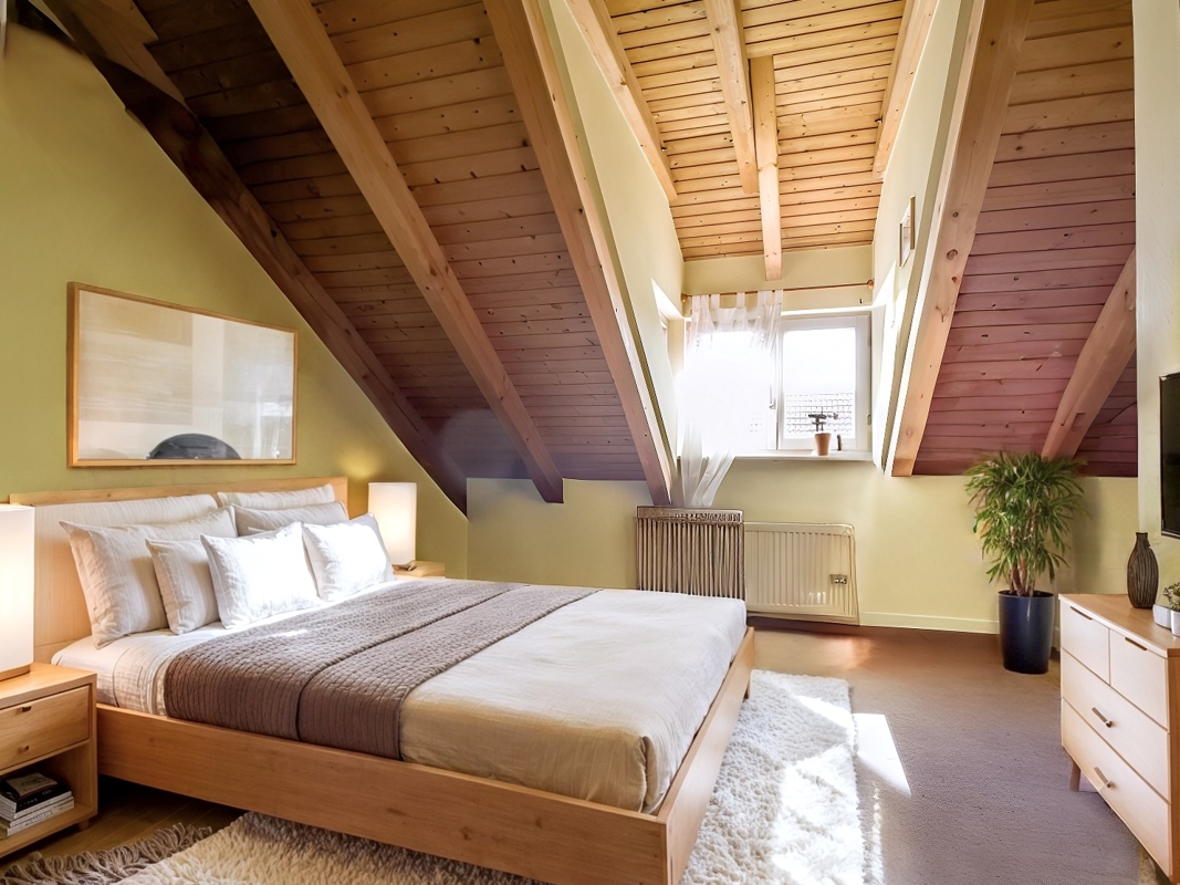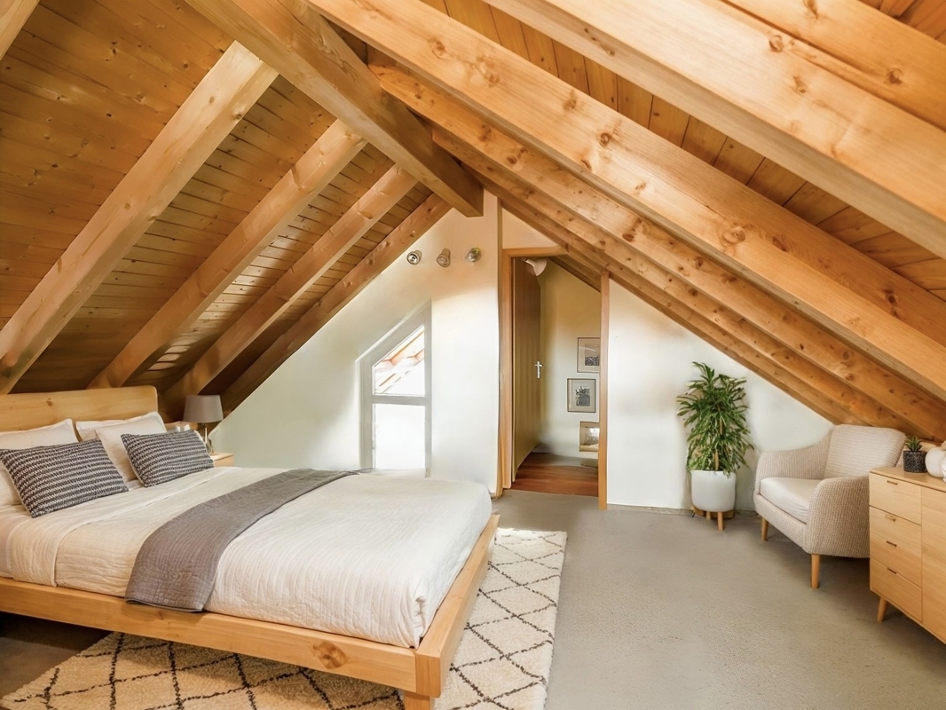 Im gesamten Erdgeschoss sowie im Einliegerbereich wurden hochwertige Fliesen verlegt, die nicht nur pflegeleicht sind, sondern auch eine moderne Atmosphäre schaffen. In den Schlafräumen im Ober- und Dachgeschoss wurde Schurwollteppichboden verlegt, der für eine warme und gemütliche Wohnatmosphäre sorgt, allerdings auch erneuerungsbedürftig ist.