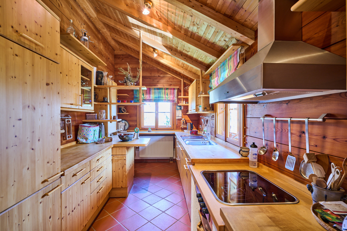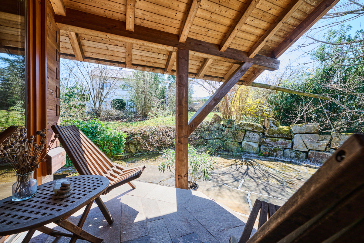Zahlreiche hochwertige Aus- und Einbauten, gepflegte Holzoberflächen und liebevolle Details unterstreichen den stilvollen Chalet-Charakter. Für den Fuhrpark stehen Ihnen sowohl eine Garage als auch ein Carport zur Verfügung.