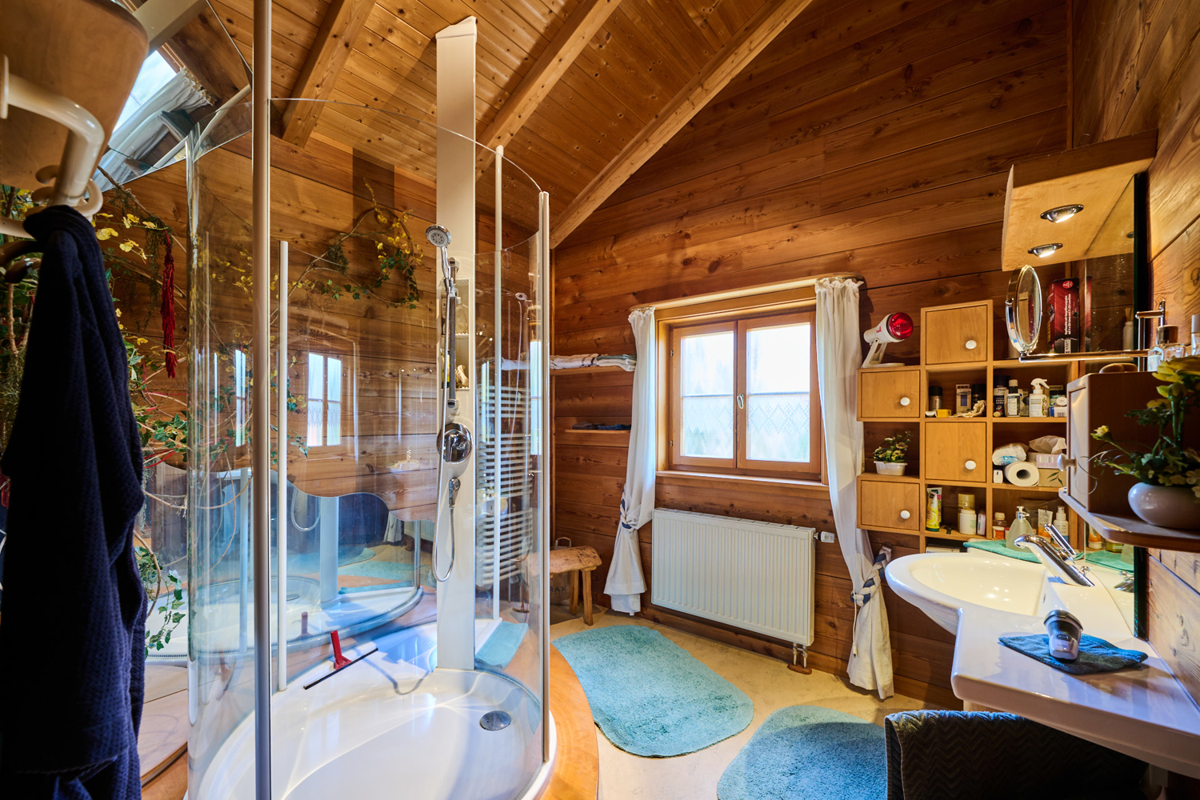 Das Hauptbad ist stilvoll und funktional gestaltet, mit einer individuell gefertigten Duschschnecke mit Glaskabine, Waschbecken, separiertem WC und einem Handtuchheizkörper. Ein weiteres Badezimmer befindet sich im Hanggeschoss.