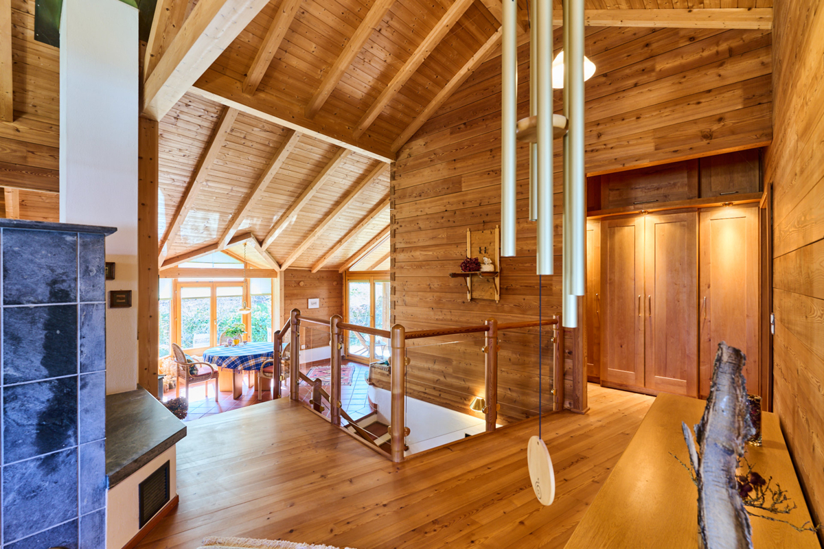 Das Gebäude wurde in zweischaliger Holzbauweise errichtet und besticht durch seine klare wohngesunde und ökologische Ausrichtung. Außen, wie teilweise auch innen, sorgt unbehandeltes Lärchenholz für eine natürliche und langlebige Hülle, während die Isofloc-Dämmung in Verbindung mit hochwertigen Putzflächen für ein hervorragendes Raumklima sorgt. Diese Bauweise trägt maßgeblich zu einem nachhaltigen und komfortablen Wohngefühl bei.Das Haus ist mit einer modernen Gas-Zentralheizung ausgestattet, die 2019 erneuert wurde. Ergänzt wird die Wärmeversorgung durch eine Solarthermie-Anlage, die zur Warmwasseraufbereitung beiträgt. Für zusätzliche Behaglichkeit sorgen zwei Öfen: ein hochwertiger Specksteinofen aus Finnland sowie ein offener Kamin mit Wassertasche im Wohnbereich. Beide bieten nicht nur effiziente Wärme, sondern auch eine wohnliche Atmosphäre. Die technische Ausstattung wird durch einen praktischen Mehrzweckraum, eine geflieste Werkstatt sowie einen separaten Wäschetrockenplatz im Haus sinnvoll ergänzt.