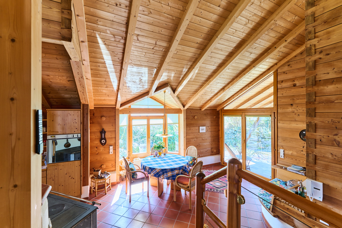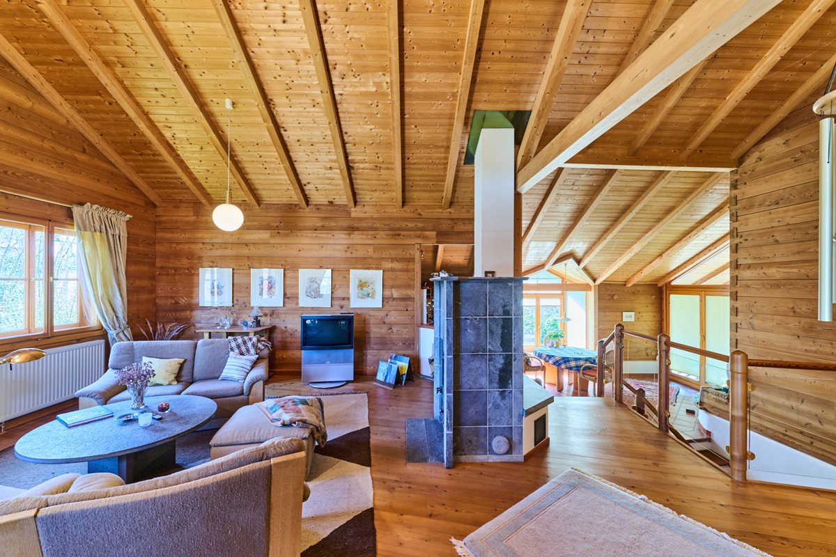 Das Herzstück des Hauses bildet der großzügige Wohn-Essbereich mit offenem Speckstein-Kamin, der nicht nur für wohlige Wärme, sondern auch für ein besonders behagliches Wohnambiente sorgt. Ergänzt wird dies durch einen finnischen Specksteinherd – ein weiteres Highlight mit Effizienz und Charme.