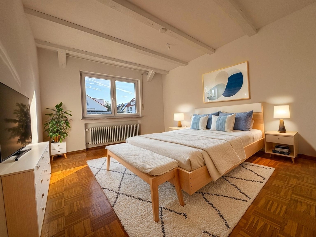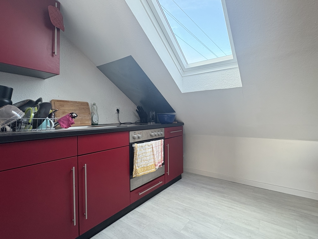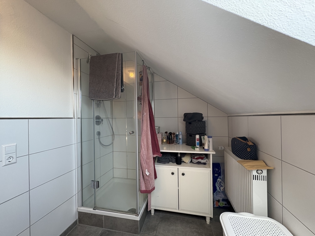 Ansprechende Materialien prägen den Wohnkomfort: In den Wohn- und Schlafräumen wurde edles Mosaikparkett verlegt, während Fliesenböden in Flur, Küche und den Sanitärräumen für pflegeleichte Eleganz sorgen. Der Wintergarten ist mit Vinylbelag ausgeführt und fügt sich mit seiner Holzkonstruktion, sichtbaren Sparren und Jalousien stimmig in das Gesamtbild ein. Die weißen, isolierverglasten Kunststofffenster sowie teilweise Holzdecken unterstreichen den charmanten Charakter des Hauses.Das Dachgeschoss ist derzeit vermietet und bietet einen attraktiven Grundriss mit Wohn- und Arbeitszimmer, Schlafzimmer, Küche in markantem rotem Dekor sowie einem Badezimmer mit Dusche. Hier ist einheitlich Vinylboden verlegt, im Schlafzimmer setzt eine Holzdecke einen warmen Akzent.