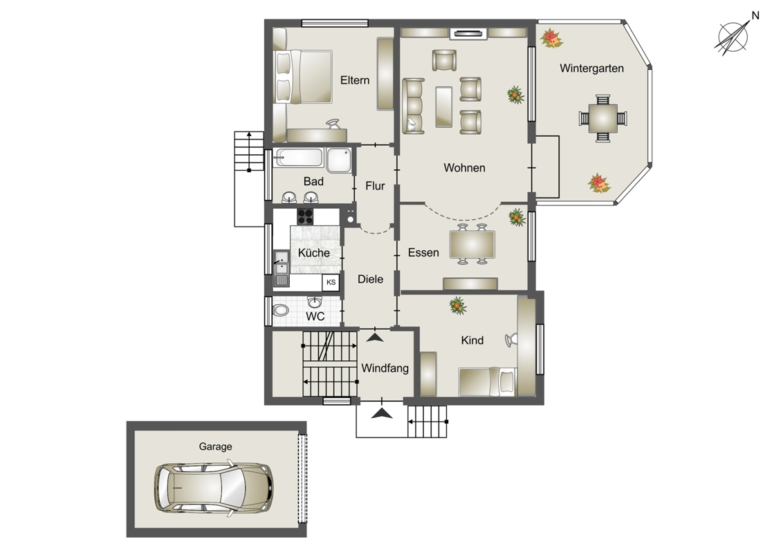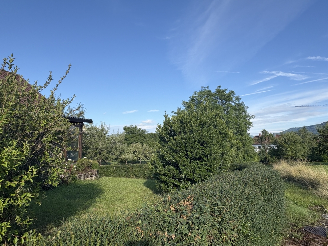Das großzügige Grundstück bietet viel Raum zur Entfaltung und lädt mit seinem schön angelegten Garten zum Verweilen ein. Die Garagenzufahrt führt direkt zum Haus, wo Ihnen eine großzügige Einzelgarage mit überdachtem Zugang zur Verfügung steht – besonders komfortabel bei jedem Wetter.