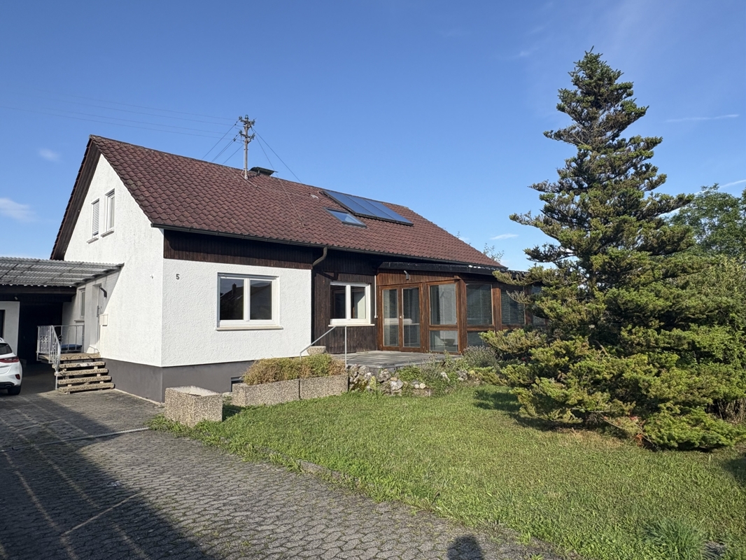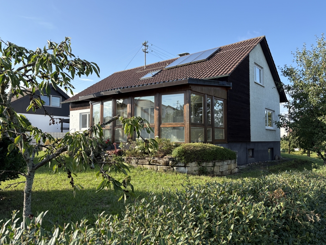 Dieses charmante Zweifamilienhaus mit zwei Wohneinheiten befindet sich in durchgrünter und doch zentraler Lage von Ofterdingen und bietet ideale Voraussetzungen für Familien oder Mehrgenerationenwohnen. Das im Jahr 1967 in solider Massivbauweise errichtete Gebäude verfügt über ein klassisches Satteldach und überzeugt mit einer durchdachten Raumaufteilung und viel Platz im Innen- wie im Außenbereich.Im Erdgeschoss erwartet Sie eine großzügige Wohnung mit vier Zimmern, Küche, Bad, separatem WC und einer einladenden Diele. Ein besonderes Highlight ist der 1991 angebaute, lichtdurchflutete Wintergarten, der das Wohnerlebnis erweitert und einen schönen Blick in den gepflegten Garten bietet.