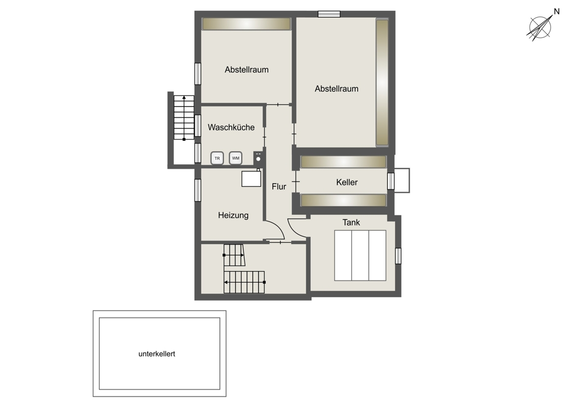 Das Untergeschoss eröffnet weitere Möglichkeiten: Neben dem Heizungs- und Tankraum gibt es eine Waschküche mit direktem Gartenausgang, einen Vorratskeller sowie zwei Hobbyräume, die vielfältig genutzt werden können.
