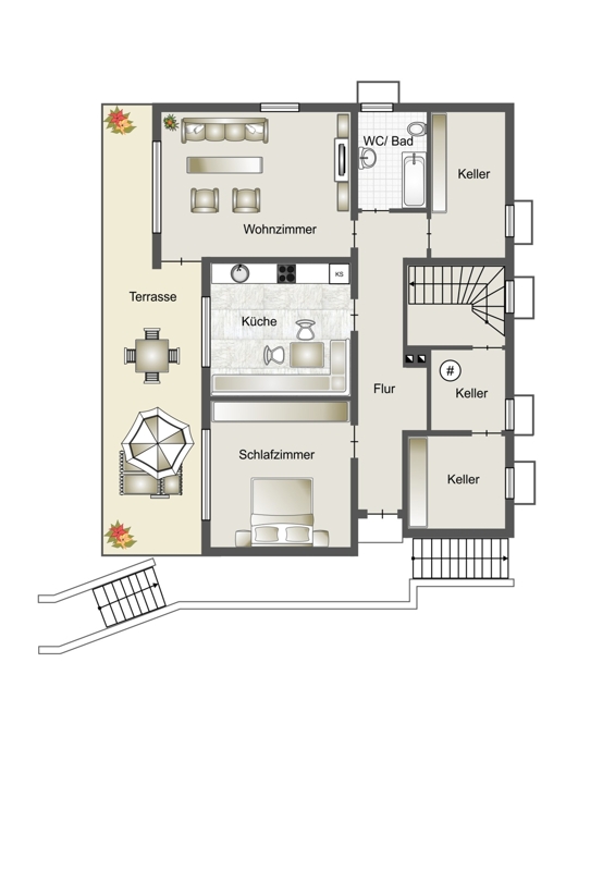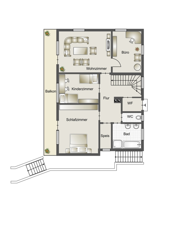 Für erholsame Stunden im Freien stehen ein Balkon in Hausbreite sowie eine großzügige, teils überdachte Terrasse zur Verfügung.