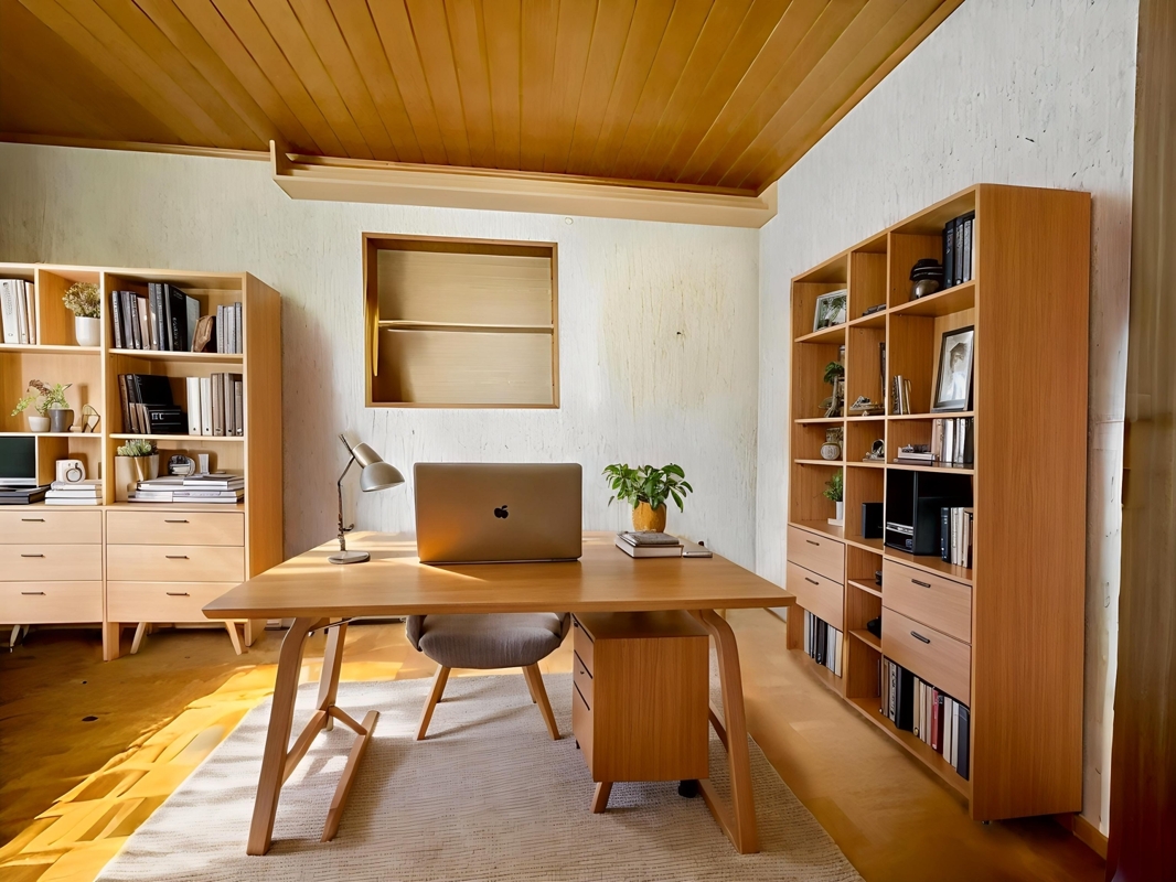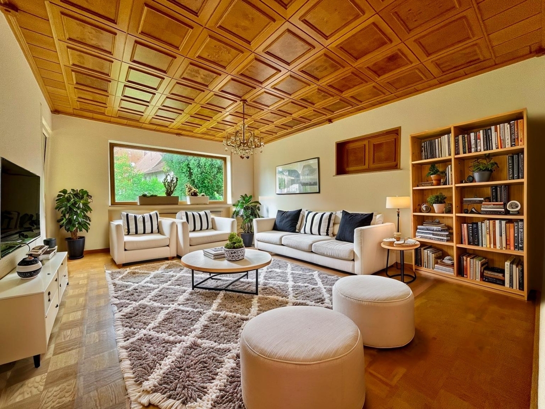 Im gesamten Haus findet sich ein abwechslungsreicher Materialmix: Die Wände sind teils mit Wandpaneelen, teils mit Tapeten versehen. Die Bäder und die Küche sind funktional gefliest, während in den übrigen Wohnräumen überwiegend Parkettböden verlegt wurden.