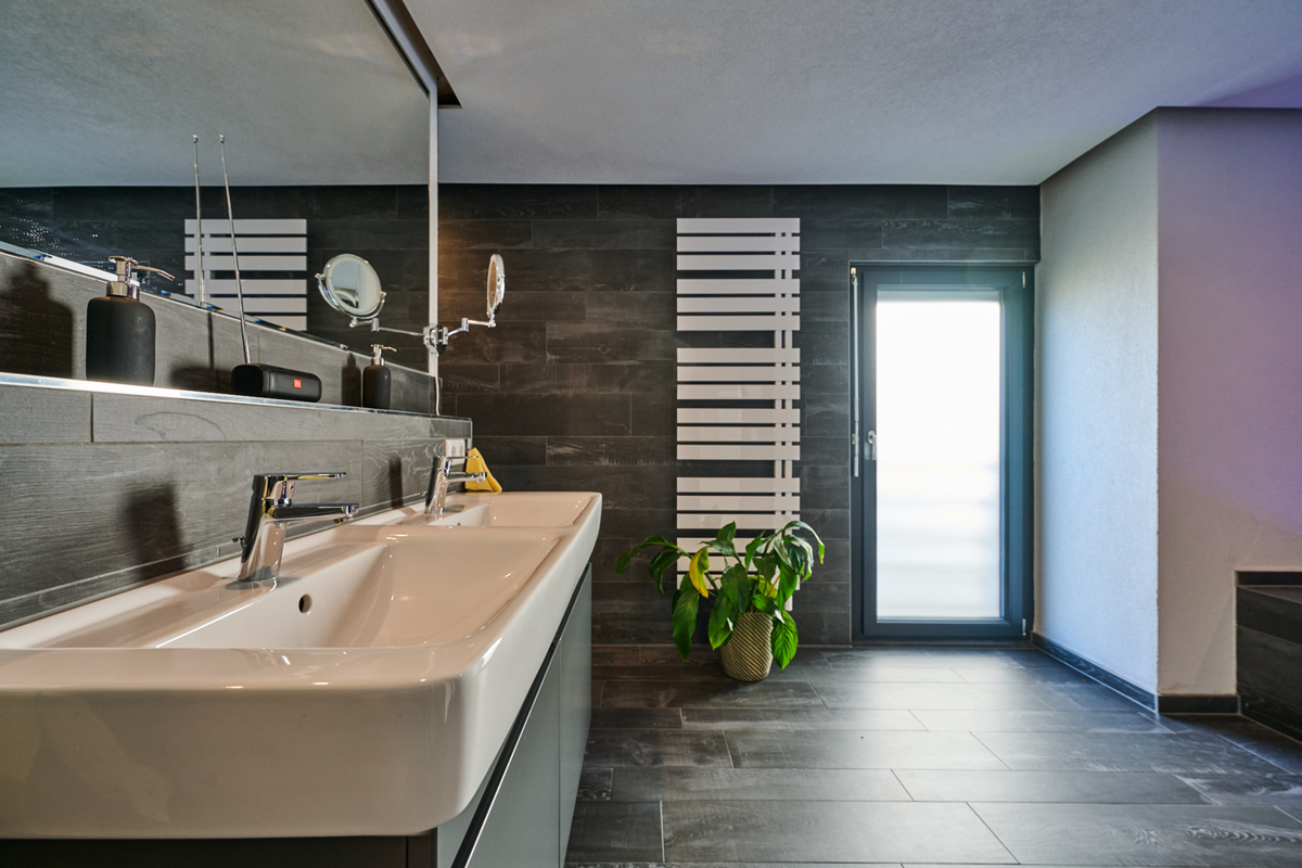 * Bäder / WC Hauptbad: Luxuswanne, bodengleiche Dusche mit Regenwaldbrause, 2 Waschbecken, separates WC und Urinal