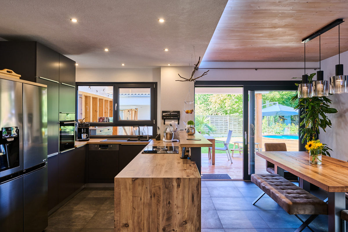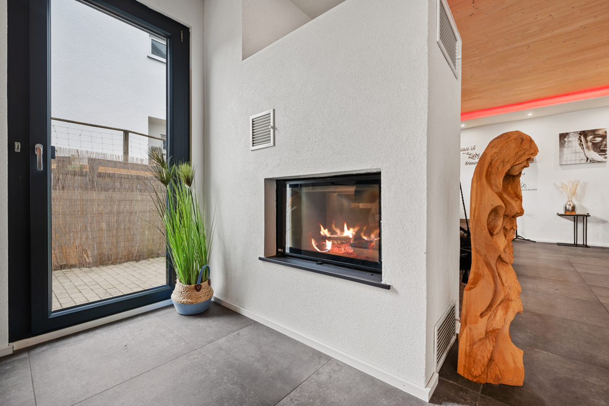 Die Wohnung verfügt über 6,5 großzügige Zimmer. Besondere Wohnqualität bietet der offene Küchen-/Ess- und Kamin-/Medienbereich mit einem offenen Kamin, der nicht nur für eine behagliche Atmosphäre sorgt, sondern dank Wassertasche auch aktiv die Heizungsanlage (Fußbodenheizung im ganzen Haus) unterstützt.