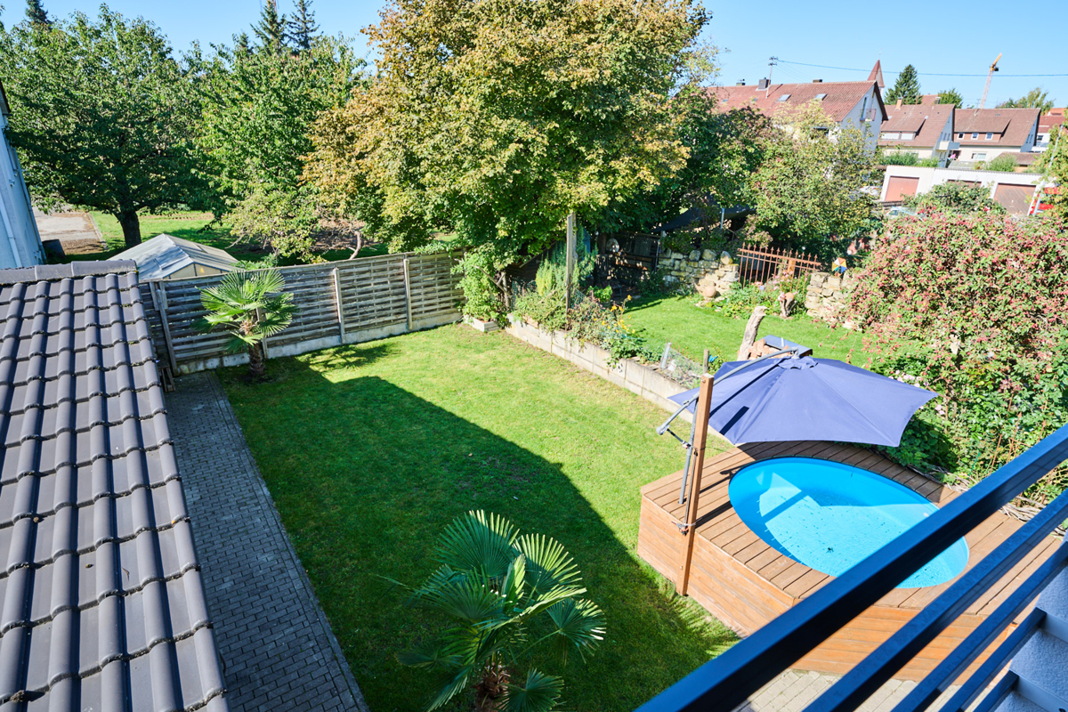 Im Außenbereich erwartet Sie eine überdachte Terrasse, eine großzügige Dachterrasse sowie ein liebevoll angelegter Garten mit kleinem Relaxpool, die zum Entspannen und Genießen einladen. Das Grundstück bietet damit vielfältige Möglichkeiten zur Erholung und Freizeitgestaltung.