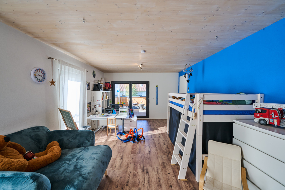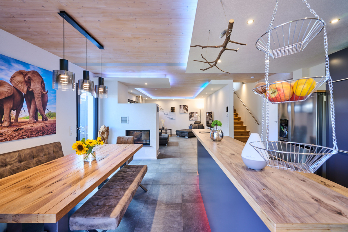 * Besondere Details: Indirekte Beleuchtung im ganzen Haus, sichtbares Gebälk im Dachgeschoss