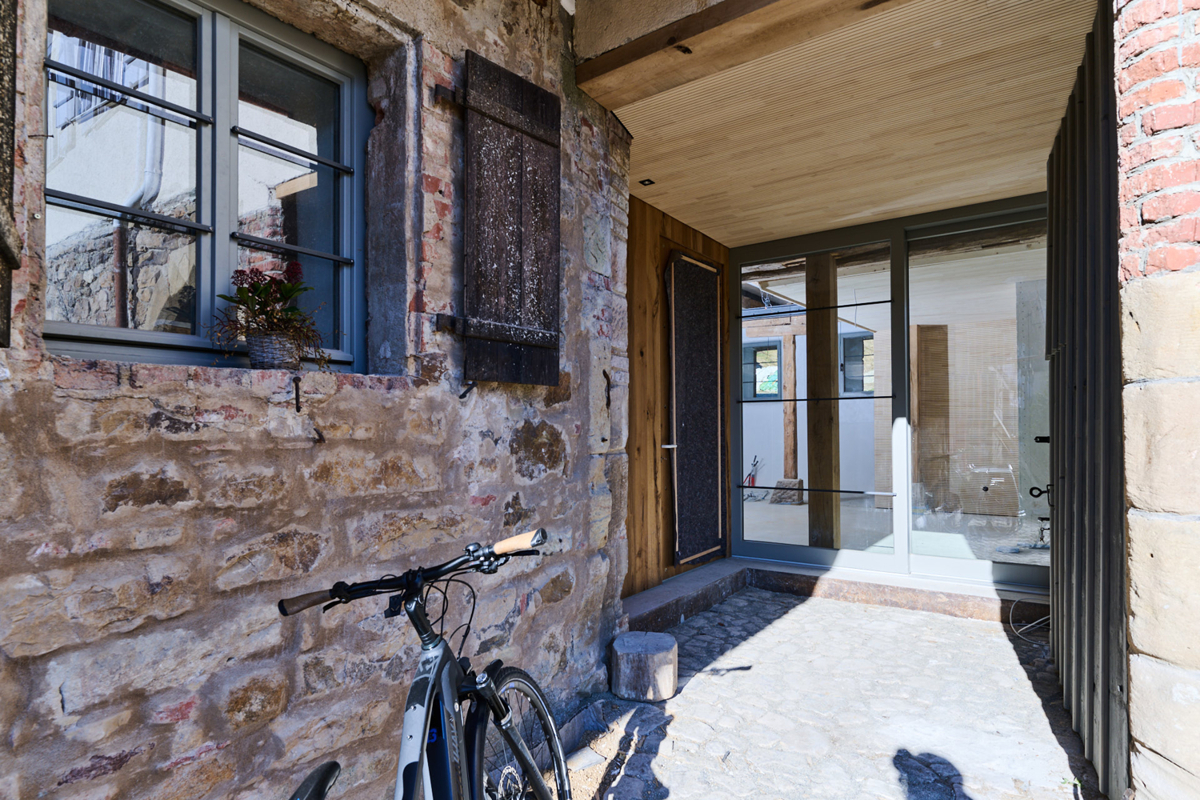 Historische Sprossenfenster wurden liebevoll restauriert und um eine Kastenfensteranlage ergänzt, um optimale Dämmwerte zu gewährleisten. Das imposante Holztor, das den Eingang bildet, wurde fachgerecht überarbeitet und führt zur eigentlichen Haustüranlage, die ebenfalls aus massivem Eichenholz gefertigt ist.