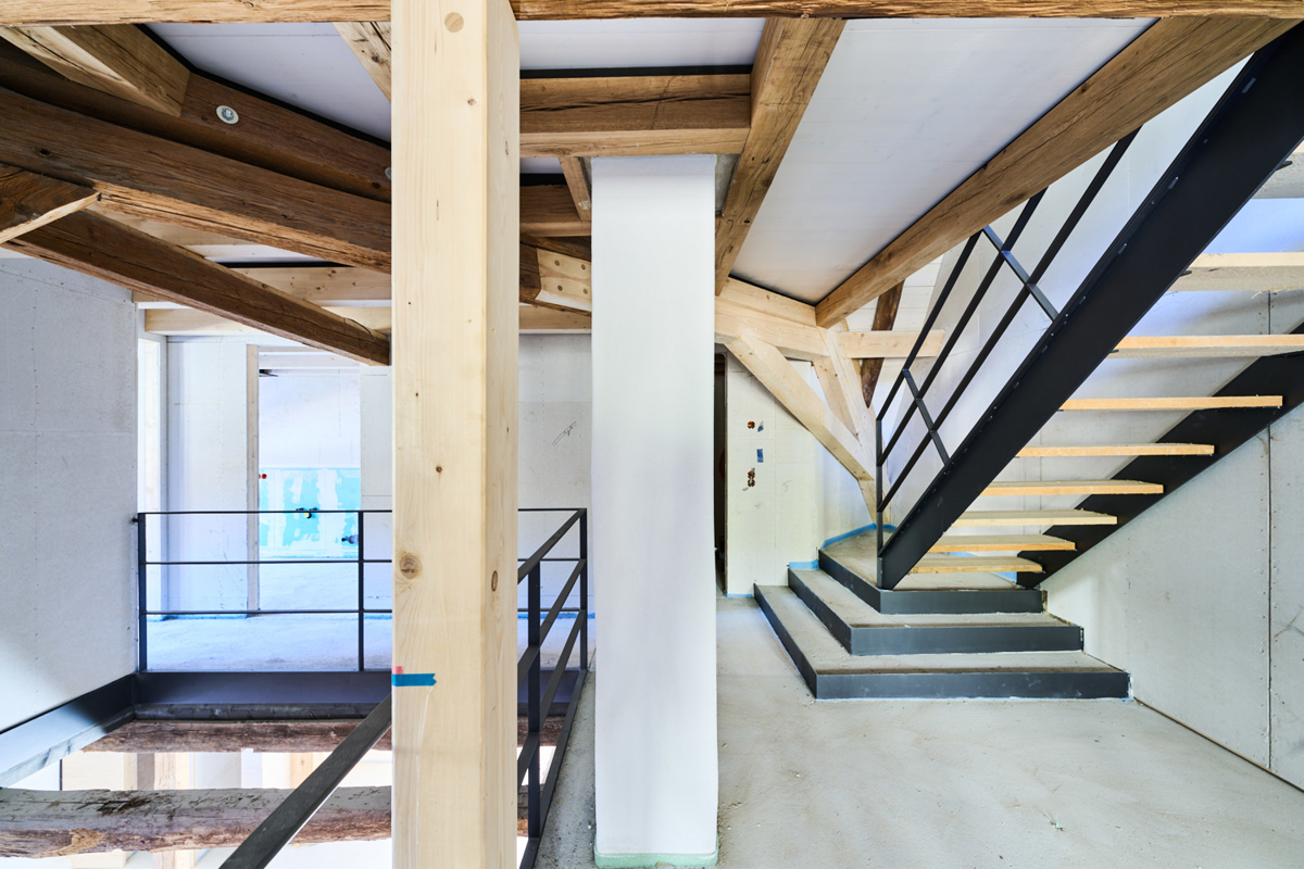 Im Innenraum beeindruckt das Bauwerk mit sichtbaren Holzbalken auf allen Etagen, die den ursprünglichen Charakter des Gebäudes unterstreichen und ein außergewöhnliches Ambiente erzeugen. Das teilweise freigelegte Sandstein-Sichtmauerwerk harmoniert mit den mit Lehmputz gestalteten Wänden und schafft ein gesundes Raumklima. Durch die umfangreichen Dämmmaßnahmen, insbesondere im Dachbereich mit Zellulose-Dämmung, erfüllt das Gebäude den geförderten KfW-Effizienzhaus-Denkmal-Standard – eine Seltenheit bei denkmalgeschützten Objekten.