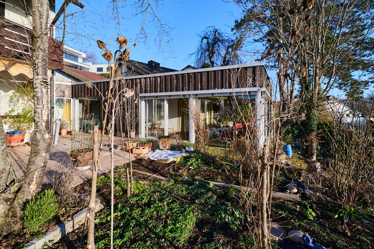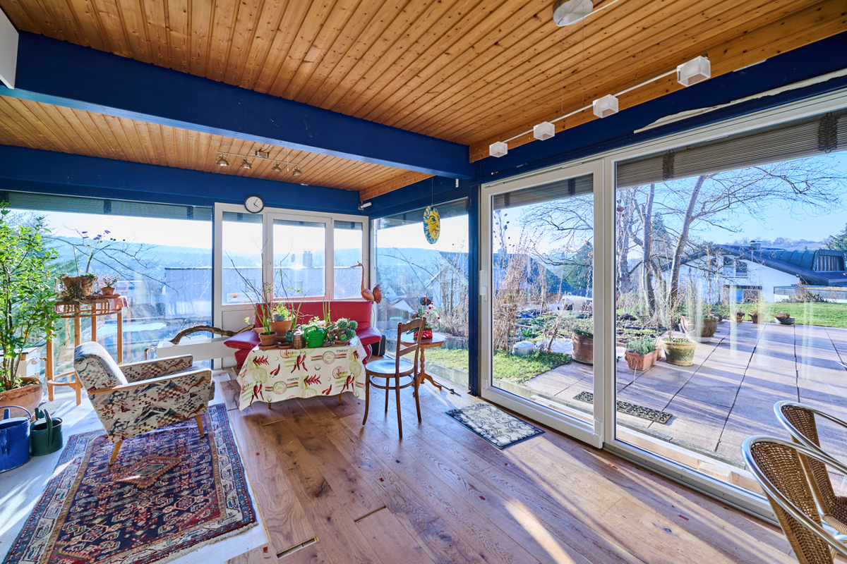 Das Haus besticht durch großzügige Außenflächen: Zwei Terrassen, ein Balkon sowie ein Wintergarten mit Kaminofen laden zum Verweilen und Genießen ein. Die angrenzende Garage sorgt für zusätzlichen Komfort.