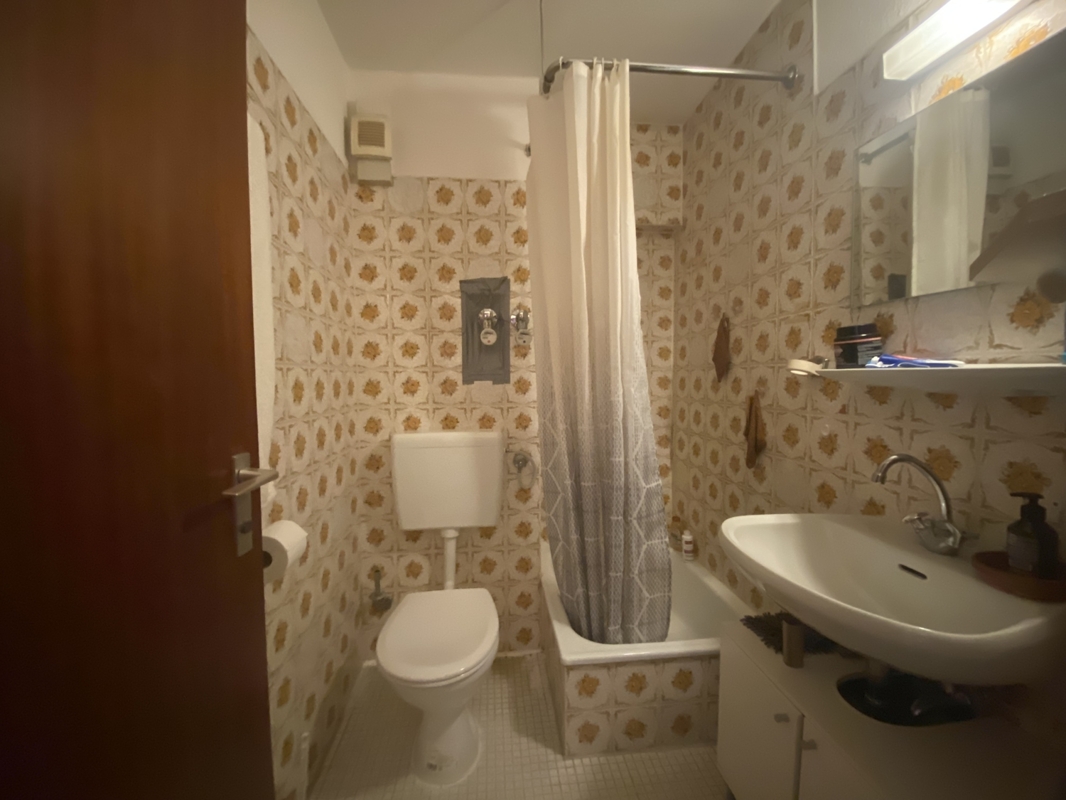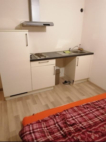 Das Badezimmer verfügt über eine Dusche, ein Stand-WC sowie ein Waschbecken. Eine praktische Kochnische mit eigener Waschmaschine ergänzt die Ausstattung und macht die Wohnung besonders funktional.