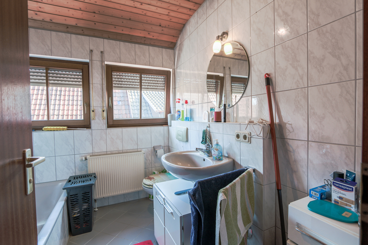 Das Badezimmer ist mit raumhoch gefliesten Wänden, gefliestem Boden und einer Holzdecke ausgestattet. Es verfügt über Dusche, Badewanne, WC und Waschbecken sowie über ein Fenster, das für angenehmes Tageslicht sorgt.