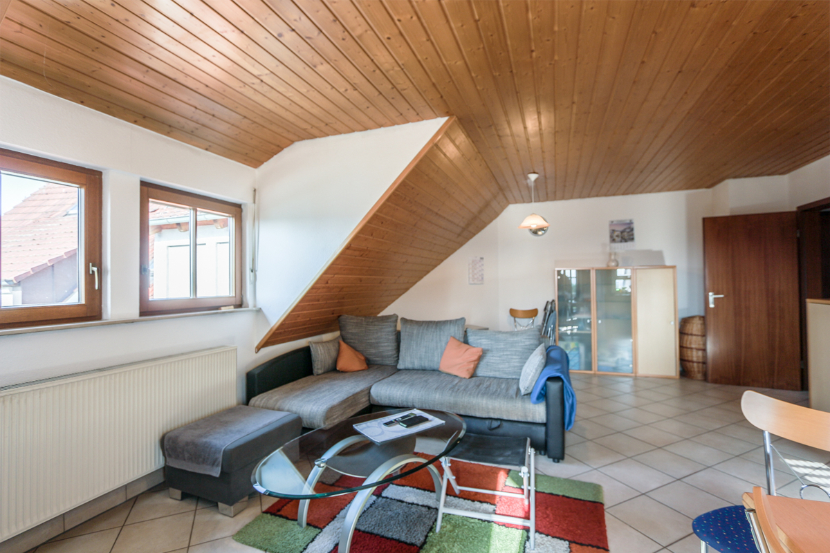 Die Wohnung liegt im Dachgeschoss des Gebäudes unter einem klassischen Satteldach.